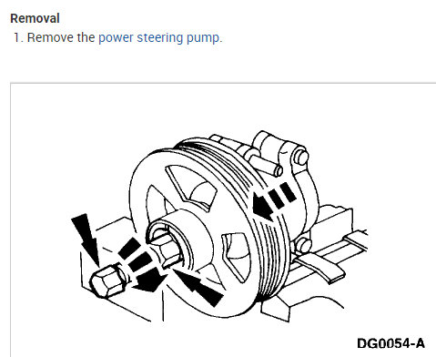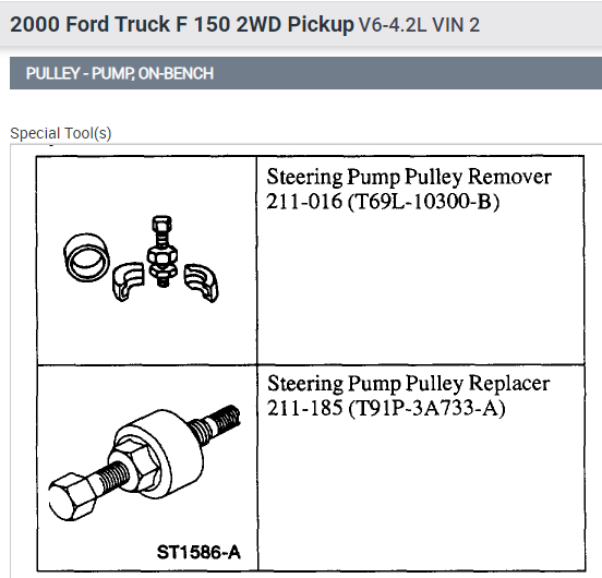 Hey, got a weird one for ya. Im too cheap to go buy a repair manual, or maybe I just believe in helping someone out, I dunno, anyway I got a 4.2L V6 that for some reason came with a PLASTIC? Power steering pump pulley. It has broken itself and I need to replace it. I ordered the new one and got a METAL one. It was brand new and ONLY cost me $12. Twelve bucks! Cheapskates. I need to remove the old one and cant figure out how. Is this something that will have to be pressed on and off or can a grease monkey like me and my old set of snap ons handle the job? Just as an ad lib, my entire family owns Ford products. We have all bought new ones within the last 10 years or so. And for these last 10 years Ford has went to patootee on their quality. Im not talking about the under payed worker assembling it but more the engineer sitting in the air conditioning saying they need to save 15 cents by putting unreliable plastic intakes and pulleys on these motors. I would rather a late 70's to late 80's model ranger or explorer. At least they were "Built to Last".