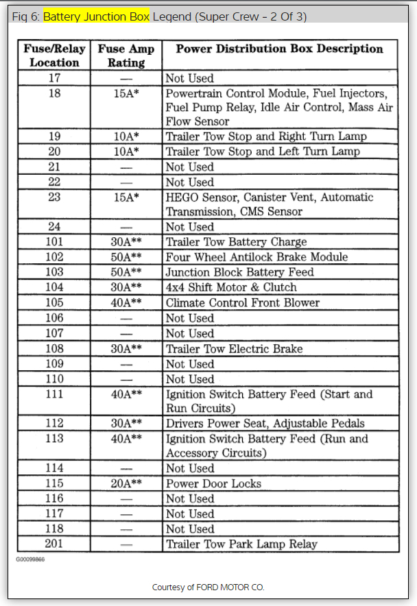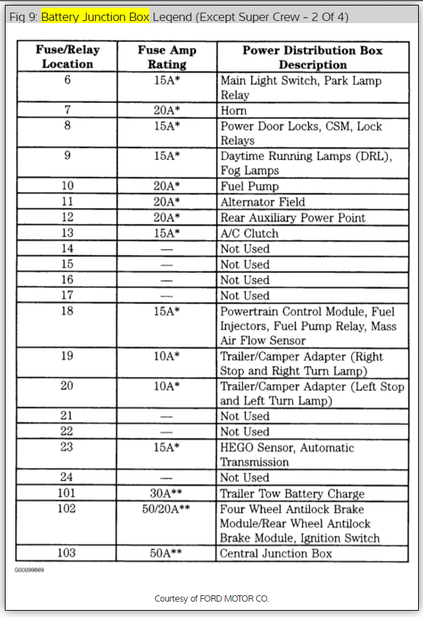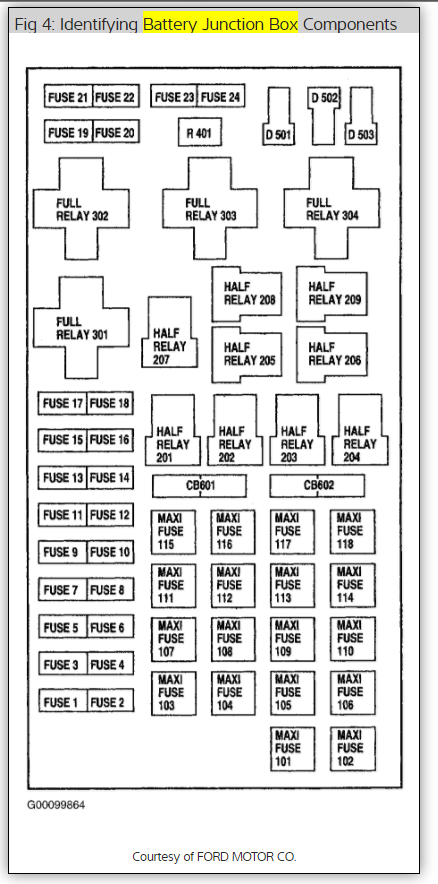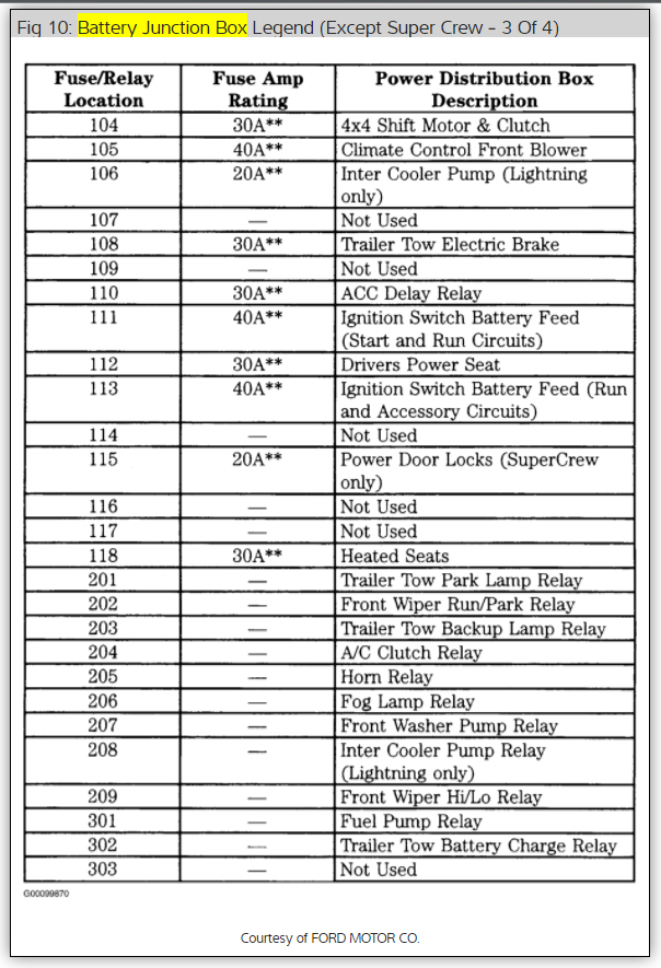TEST B: BLOWER MOTOR INOPERATIVE 1. Turn ignition off. Check Central Junction Box (CJB) fuse No. 22 (10-amp). If fuse is okay, go to step 3 . If fuse is blown, go to next step. 2. Remove A/C blower relay from blower/flasher relay block (located behind center of instrument panel). Disconnect function selector switch 4-pin harness connector C217. Measure resistance between ground and function selector switch harness connector C217 terminal No. 1 (Brown/Orange wire). See Fig. 4 . If resistance is 10 k/ohms or more, repair short to ground in White/Violet wire between function selector switch and CJB. See WIRING DIAGRAMS . 3. Check Battery Junction Box (BJB) fuse No. 105 (40-amp). If fuse is blown, go to next step. If fuse is okay, go to step 7 . 4. Disconnect blower motor 2-pin harness connector C190. Turn ignition switch to RUN position. Measure resistance between ground and blower motor harness connector C190 terminal No. 2 (Brown/Yellow wire) while moving function selector switch through all positions. See Fig. 2 . If resistance is 10 k/ohms or more in all positions except off, replace blower motor. If resistance is less than 10 k/ohms in all positions except off, go to next step. Fig. 4: Identifying Function Selector Switch Harness Connector C217/C220 Terminals Courtesy of FORD MOTOR CO. 5. Turn ignition off. Remove blower motor relay from blower/flasher relay box (located behind center of instrument panel). Measure resistance between ground and blower motor harness connector terminal No. 2 (Brown/Yellow wire). See Fig. 2 . If resistance is 10 k/ohms or more, go to next step. If resistance is less than 10 k/ohms, repair short to ground in Brown/Yellow wire between blower motor relay and blower motor. See WIRING DIAGRAMS . 6. Measure resistance between ground and BJB fuse No. 105 (40-amp) terminal No. 2 (Black/Light Green wire). If resistance is 10 k/ohms or more, replace A/C blower motor relay. If resistance is less than 10 k/ohms, repair short to ground in Black/Light Green wire. See WIRING DIAGRAMS . 7. Disconnect blower motor 2-pin harness connector C190. Turn ignition switch to RUN position. Measure voltage between ground and blower motor harness connector C190 terminal No. 2 (Brown/Yellow wire) while moving function selector switch through each mode. See Fig. 2 . If more than 10 volts exists in all switch positions except off, go to next step. If more than 10 volts does not exist in all switch positions except off, go to step 10 . 8. Turn ignition off. Turn blower motor switch to HI position. Measure resistance between ground and blower motor harness connector terminal No. 1 (Orange/Black wire). See Fig. 2 . If resistance is less than 10 ohms, replace blower motor. If resistance is 10 ohms or more, go to next step. 9. Disconnect blower motor resistor 4-pin harness connector C191. Measure resistance of Orange/Black wire between blower motor harness connector terminal No. 1 and blower motor resistor harness connector terminal No. 2. See Fig. 1 and Fig. 2 . If resistance is less than 5 ohms, repair Black wire between blower relay and ground. See WIRING DIAGRAMS . 10. Turn ignition off. Remove blower motor relay from blower/flasher relay block. Measure voltage between ground and blower motor relay socket terminal No. 87 (Black/Light Green wire). See Fig. 5 . If 10 volts or more exists, go to next step. If less than 10 volts exists, repair Black/Light Green wire between BJB and blower relay. See WIRING DIAGRAMS .Fig. 5: Identifying Blower Relay Connector Socket Terminals Courtesy of FORD MOTOR CO. 11. Turn ignition switch to RUN position. Measure voltage between ground and blower motor relay socket terminal No. 86 (Brown/Orange wire). See Fig. 5 . While selecting each mode on function selector switch. If 10 volts or more exists in all positions except off, go to step 14 . If 10 volts or more does not exist in all positions except off, go to next step. 12. Turn ignition off. Disconnect function selector switch 4-pin harness connector C217. Turn ignition switch to RUN position. Measure voltage between ground and function selector switch harness connector C217 terminal No. 2 (White/Violet wire). See Fig. 4 . If 10 volts or more exists, go to next step. If less than 10 volts exists, repair open in White/Violet wire between CJB and function selector switch. See WIRING DIAGRAMS . 13. Turn ignition off. Measure resistance of Brown/Orange wire between function selector switch harness connector C217 terminal No. 1 and blower motor connector socket terminal No. 86. See Fig. 4 and Fig. 5 . If resistance is less than 5 ohms, replace function selector switch. If resistance is 5 ohms or more, repair open in Brown/Orange wire. See WIRING DIAGRAMS . 14. Turn ignition off. Measure resistance between ground and blower motor relay socket terminal No. 85 (Black wire). If resistance is less than 5 ohms, go to next step. If resistance is 5 ohms or more, repair open in Black wire. 15. Disconnect blower motor 2-pin harness connector C190. Measure resistance of Brown/Yellow wire between blower motor relay socket terminal No. 30 and blower motor harness connector C190 terminal No. 2. See Fig. 2 and Fig. 5 . If resistance is less than 5 ohms, replace blower motor relay. If resistance is 5 ohms or more, repair open in Brown/Yellow wire. See WIRING DIAGRAMS .