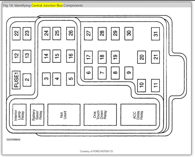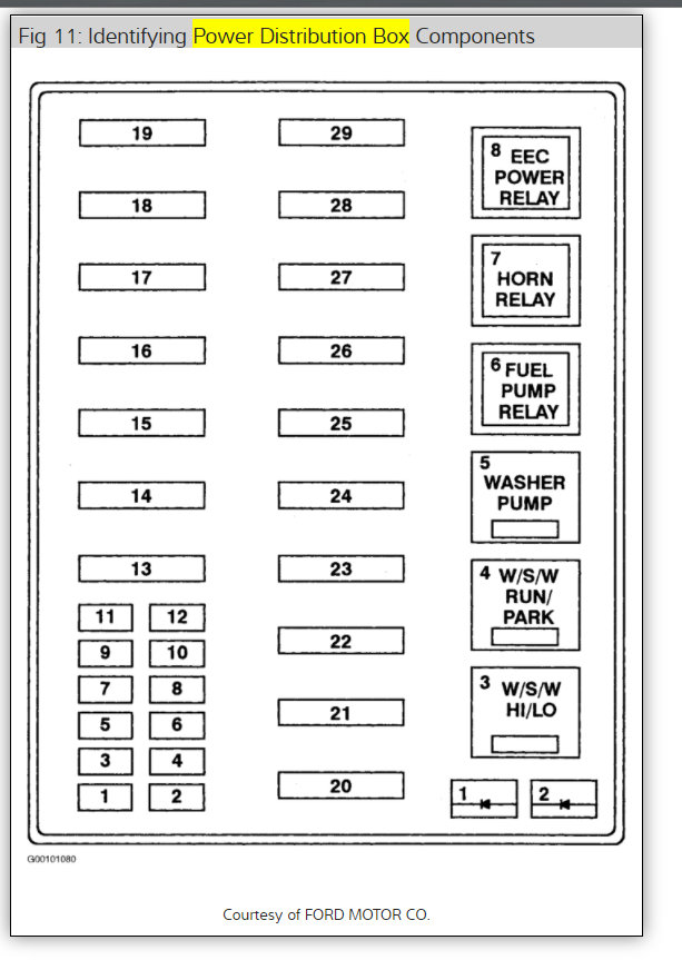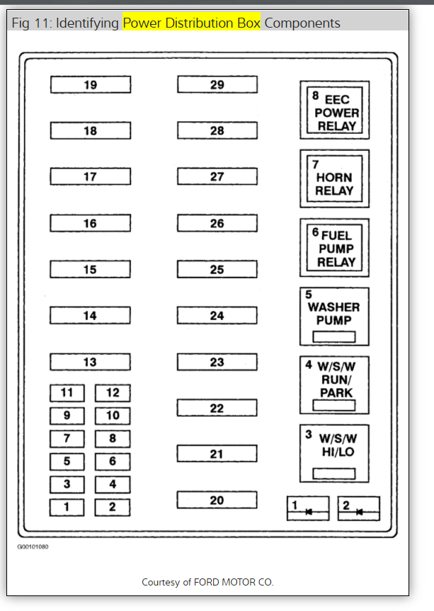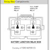When ignition switch is turned to START position, PCM operates fuel pump relay to provide fuel for starting engine. PCM senses engine speed and shuts off fuel pump by opening ground circuit to fuel pump relay when engine stops or speed drops to less than 120 RPM. When ignition switch is in ON position, EEC power relay is energized (contacts closed). Power is provided to fuel pump relay and timer in PCM. Fuel pump receives power through fuel pump relay contacts.