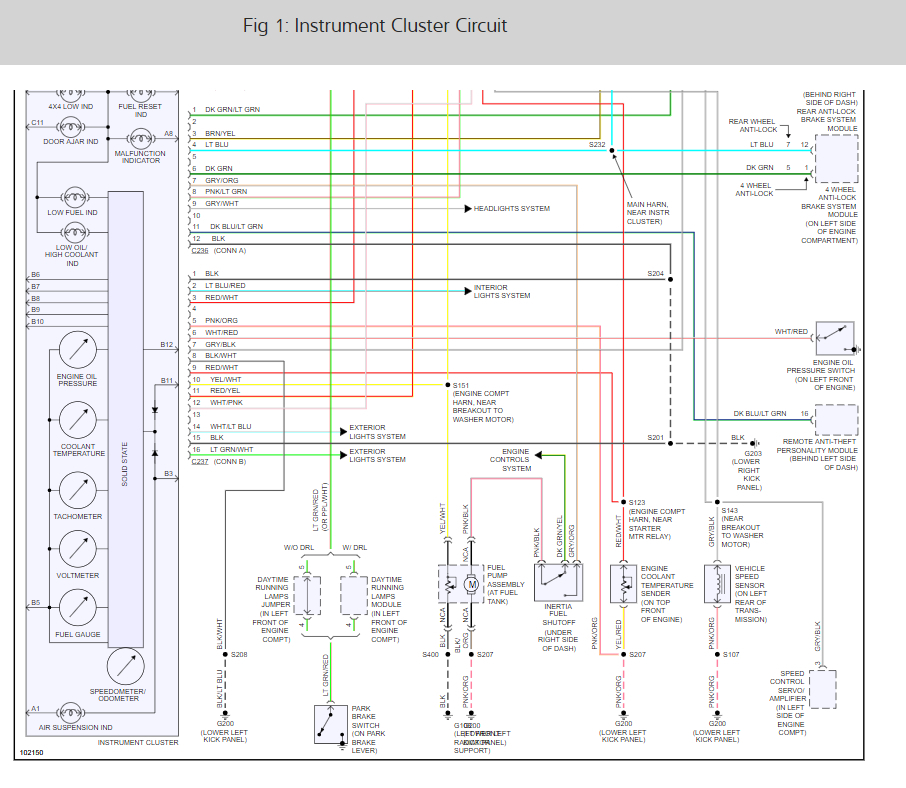 The last voltage reading is on the white / black wire shown way down at the very bottom of the first diagram. Back-probe that one with the engine running. When the generator is working, you'll find very close to half of system voltage, or 7 volts. It's that voltage that tells the voltage regulator the system is working, and to put 14 volts back out on the light green / red wire. With the same system voltage now on both sides of the dash light, the light turns off.