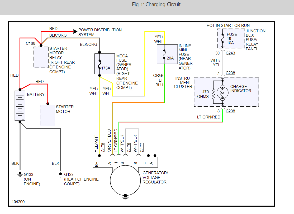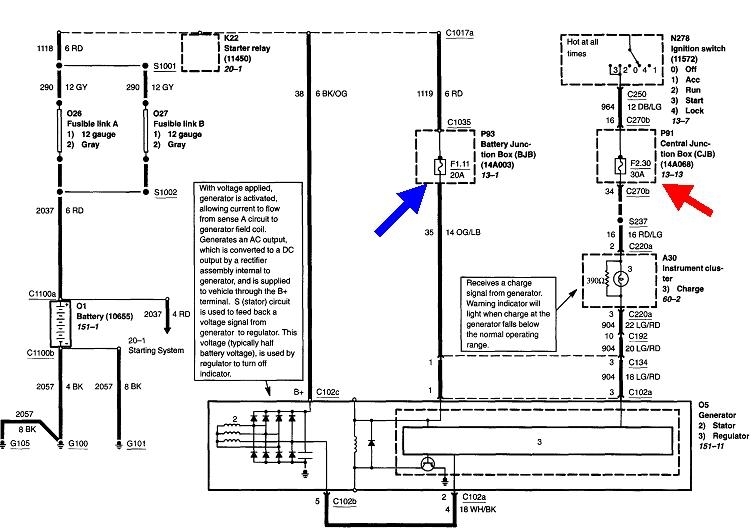 The next voltage reading is at the large output wire bolted to the back of the generator. That one must also have full battery voltage all the time and it must always be the same as what you find right at the battery. If you find 0 volts there with the engine not running, and possibly real high voltage, in the order of 15 volts or more when the engine is running, the fusible links are burned open. Those are wires spliced into the circuit, with special dull-colored insulation that is designed to not burn or melt. I doubt you're going to find a problem with them because they also feed the starter relay. If they were burned open, you'd be diagnosing a failure to crank, not a charging problem.