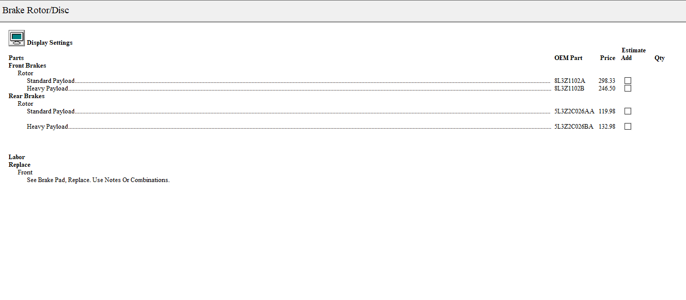 the best quality brake pads are the original ones, part number for front rotors are 8L3Z1102A $298.33, for heavy payload rotors 8L3Z1102B 246. $5.00.