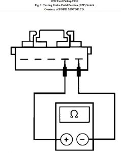 CRUISE CONTROL INOPERATIVE 1. Remove splash shield from throttle linkage. Ensure actuator cable is properly connected to throttle body and speed control servo. Pull on cable at throttle linkage side and note accelerator pedal movement. Check for smooth operation of cable. Correct as necessary and test operation. 2. Unplug harness connector from servo located near master cylinder. Turn ignition to run position. Measure voltage between servo harness connector terminal No. 7 (Light Blue/Pink wire) and terminal No. 10 (Black wire). See Fig. 1 . If battery voltage is present, go to step 4 . If battery voltage is not present, check fuse No. 5. Replace fuse if necessary. If fuse is okay, go to next step. Fig. 1: Identifying Servo/Actuator Harness Connector Terminals 3. Turn ignition off. Measure resistance between harness connector terminal No. 10 (Black wire) and ground. If resistance is less than 5 ohms, repair Light Blue/Pink wire. If resistance is 5 ohms or greater, repair Black wire to ground. See WIRING DIAGRAMS . 4. With brake pedal released and ignition off, measure voltage between servo harness connector terminal No. 4 (Tan/Light Blue) and terminal No. 10 (Black wire). If no voltage is present, go to next step. If voltage is present, install new BPP switch and check system for normal operation. 5. Turn ignition off. Measure resistance between servo harness connector terminal No. 4 (Tan/Light Blue) and terminal No. 10 (Black wire). If resistance is less than 20 ohms, go to next step. If resistance is 20 ohms or greater, go to step 15 . 6. Measure voltage between servo harness connector terminal No. 9 (Black/Yellow wire) and terminal No. 10 (Black wire). If battery voltage is not present, go to next step. If battery voltage is present, go to step 9 . 7. Unplug connector from brake pressure switch, located on master cylinder. Measure resistance between switch terminals with brake pedal released. If resistance is less than 5 ohms, go to next step. If resistance is 5 ohms or greater, replace switch and check system for normal operation. 8. Measure voltage between brake pressure switch harness connector terminal (Light Green/Red wire) and ground. If battery voltage is present, repair open in Black/Yellow wire. If battery voltage is not present, repair open in fuse or Light Green/Red wire between fuse and switch. See WIRING DIAGRAMS . Check system for normal operation. 9. Check for voltage between servo harness connector terminal No. 5 (Light Blue/Black wire) and terminal No. 10 (Black wire). If voltage is present, speed control actuator switch is stuck on. Install new speed control actuator switch and check for normal system operation. See COMMAND SWITCHES under REMOVAL & INSTALLATION. If no voltage is present, go to next step. 10. With speed control ON switch depressed, check for voltage between servo harness connector terminal No. 5 (Light Blue/Black wire) and terminal No. 10 (Black wire). If voltage is present, go to step 13 . If no voltage is present, go to next step. 11. Disable air bag restraint system. See AIR BAG RESTRAINT SYSTEMS article. Disconnect air bag sliding contact connector at base of steering column. Measure resistance of Dark Green/Orange wire between servo harness connector terminal No. 6 and air bag sliding contact connector (harness side). If resistance is less than 5 ohms, go to next step. If resistance is 5 ohms or greater, repair open or high resistance in Dark Green/Orange wire. See WIRING DIAGRAMS . Check system for normal operation. 12. With Driver's air bag module removed, measure resistance of air bag sliding contact between column side of connector at base of steering column and sliding contact. Connect one ohmmeter lead to connector terminal corresponding to Light Blue/Black wire in harness side of connector, and other ohmmeter lead to appropriate sliding contact pin. See WIRING DIAGRAMS . If resistance is less than 1 ohm, install new speed control actuator switch and check system for normal operation. See COMMAND SWITCHES under REMOVAL & INSTALLATION. If resistance is one ohm or greater, replace air bag sliding contact and check system operation. See AIR BAG RESTRAINT SYSTEMS article. 13. While depressing SET/ACCEL button on steering wheel, measure resistance between servo harness connector terminal No. 5 (Light Blue/Black wire ) and terminal No. 6 (Dark Green/Orange wire). Resistance should be between 640 ohms and 720 ohms. If resistance is as specified, go to next step. If resistance is not as specified, install new speed control actuator switch and check system for normal operation. See COMMAND SWITCHES under REMOVAL & INSTALLATION. 14. Test drive vehicle and observe speedometer operation. If speedometer operates properly, repair circuit (Gray/Black wire) between servo connector terminal No. 3 and PCM 104-pin connector terminal No. 68. See WIRING DIAGRAMS . If speedometer does not operate properly, see INSTRUMENT PANELS article. 15. Turn igniton off. Disconnect Brake Pedal Position (BPP) switch. Measure resistance between BPP switch harness connector terminal No. 1 (Black/Pink wire) and ground. If resistance is less than 5 ohms, go to next step. If resistance is 5 ohms or greater, repair Black/Pink wire between BPP switch and ground connection. See WIRING DIAGRAMS . Check system for normal operation. 16. Measure resistance between BPP switch terminals No. 1 and No. 2. See Fig. 2 . If resistance is less than 5 ohms, go to next step. If resistance is 5 ohms or greater, install new BPP switch and check system for normal operation. Fig. 2: Testing Brake Pedal Position (BPP) Switch Courtesy of FORD MOTOR CO. 17. Disconnect Clutch Pedal Position (CPP) switch or jumper. Measure resistance of Red/Light Green wire between CPP connector and BPP connector. If resistance is less than 5 ohms, go to next step. If resistance is 5 ohms or greater, repair Red/Light Green wire or connections and check system operation. See WIRING DIAGRAMS . 18. Measure resistance of Tan/Li