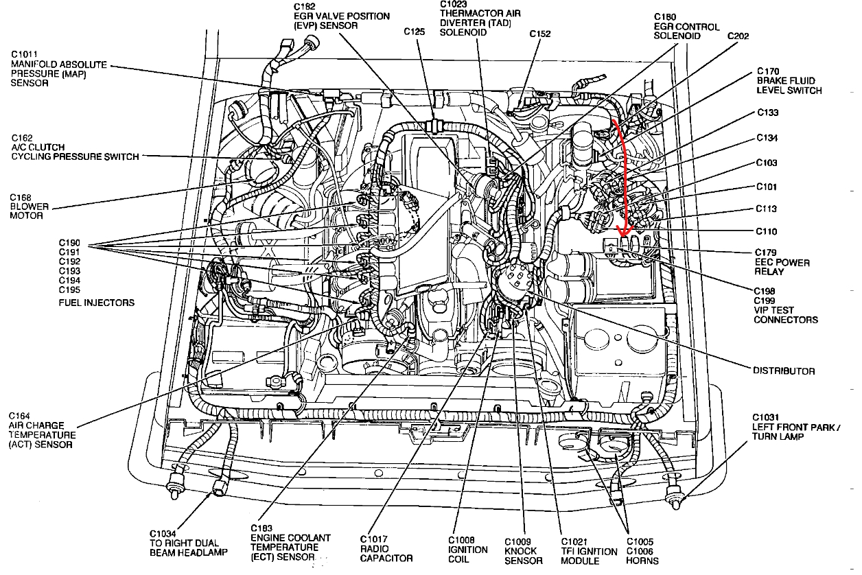 LH Side Of Engine Compartment, On Relay Bracket. Fuel pump relay is next to the EEC Relay. See the red arrow below. Check out the images (below). Please let us know what happens.