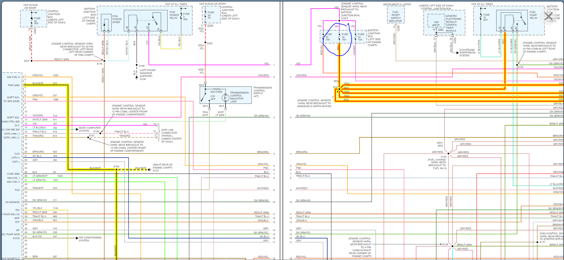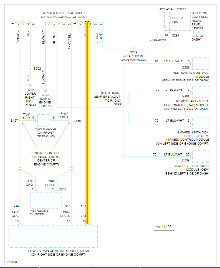 Next, we need to check the voltage on pin 13 at the DLC. If you are not getting any voltage, then go to the PCM and check on the same wire to see if anything is coming out of the PCM.