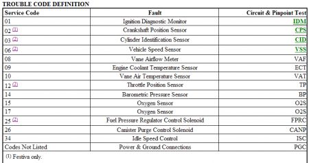 RETRIEVING CODES Reading Service Codes Engine control system communicates malfunctions to technician through service codes. These service codes are 2-digit numbers representing a particular defect. Service codes are transmitted through STO connector. Service codes are displayed as timed pulses, and may be read with a VOM or Super Star II tester. VOM displays codes by needle sweeps. See Fig. 2 . Turn ignition off. Ensure all procedures of EQUIPMENT HOOK-UP have been followed. Engine should be at normal operating temperature. Fig. 2: Reading Service Codes With VOM Courtesy of FORD MOTOR CO. VOM Disconnect and reconnect jumper wire from STI terminal to ground. Turn ignition on. Record displayed codes. Erase codes, and repeat test procedure to verify all codes are currently valid. See ERASING CODES & RETESTING. Service only those codes which appear during retest. Refer to TROUBLE CODE DEFINITION table to find appropriate pinpoint test. MIL Turn ignition on. Connect a jumper wire between STI connector and ground. Observe MIL, and record pulses to determine codes stored. Super Star II Tester Set center button to TEST position. Turn ignition on. Turn tester on. When activated, tester should display 888 for 2 seconds. Release and reset center TEST button. After all codes are displayed, release center button. All codes in tester memory may now be reviewed. NOTE: If MIL flashes continuously prior to connecting test equipment, go to PINPOINT TEST STI. Page 1 of 1 TESTS W/CODES -1993 Ford Festiva GL 3/29/2009