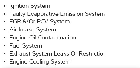 Fuel System - Excessive fuel pressure, leaking or contaminated fuel injectors, leaking fuel pressure regulator, low fuel pressure or engine running out of fuel or vapory recovery system fault.