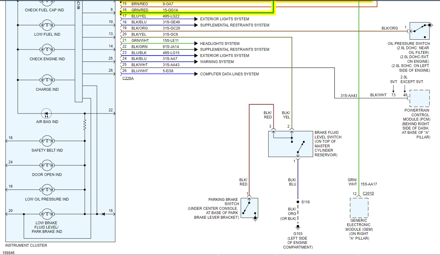 The instrument cluster is a hybrid electronic cluster (HEC) with two basic configurations, the base cluster and the optional instrument cluster. In addition to the two basic configurations, the SVT uses a modified optional cluster in combination with a separate oil pressure and oil temperature cluster. The base instrument cluster, optional instrument cluster and the oil pressure and oil temperature cluster receive and output information utilizing both hardwired circuitry and the standard corporate protocol (SCP) or the controller area network (CAN) communication network (2.3L only).