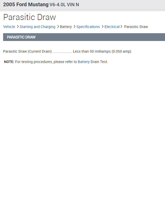 The Parasitic Draw (Current Drain) specification for your vehicle : Less than 50 milliamps (0.050 amp)