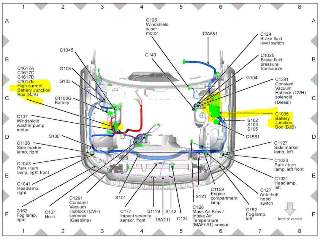 Pic 1 shows locations under the hood. The BCM is under the dash behind the glove box.