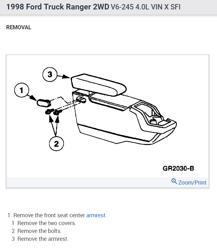 Use the picture below to help. You will have to remove the small arm rest screw covers to access the bolts. There will be 4 arm rest bolts and 2 rear arm rest screws along with 2 screws in the front utility tray. Check out the diagrams (Below). Please let us know if you need anything else to get the problem fixed.