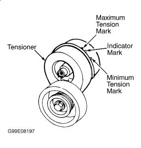On vehicles with serpentine belts, belt tension is adjusted automatically. Some automatic belt tensioners have belt wear indicator marks located on top of tensioner housing. If tension indicator mark is not between wear indicator marks, belt is worn or incorrect belt is installed. Replace belt, if necessary