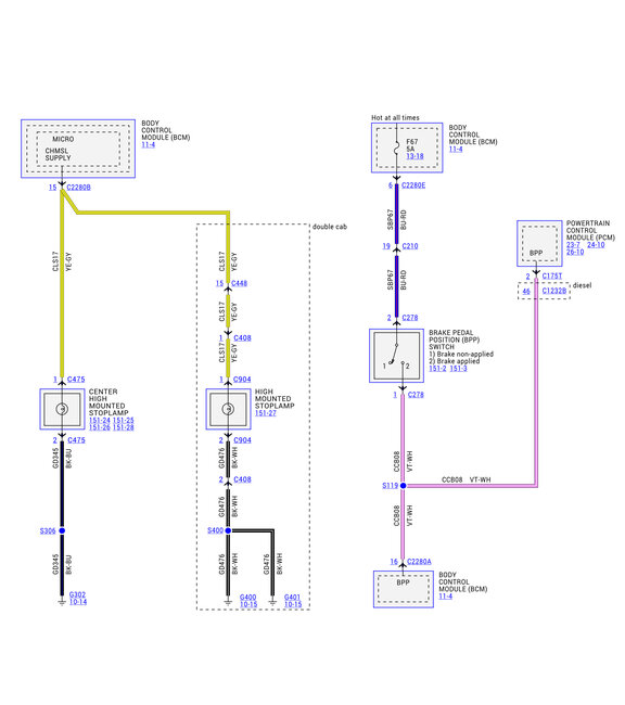 I need a wiring diagram for the brake pedal switch including wiring to the taillights. My brake lights are not working, fuses and relays are okay, brake pedal switch replaced but still the same. I now need the wiring diagram to trace the wires and find out where the problem is. Thank you so much.