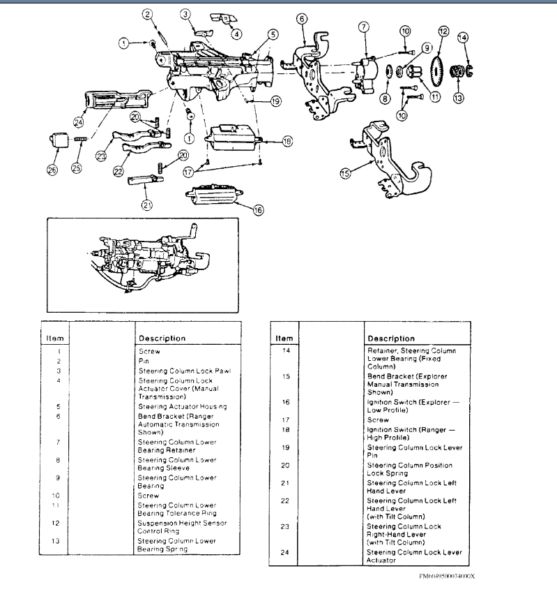 12. Install steering column lower bearing retainer and steering column lower mounting bracket. Torque screws to 5-8 ft lb.