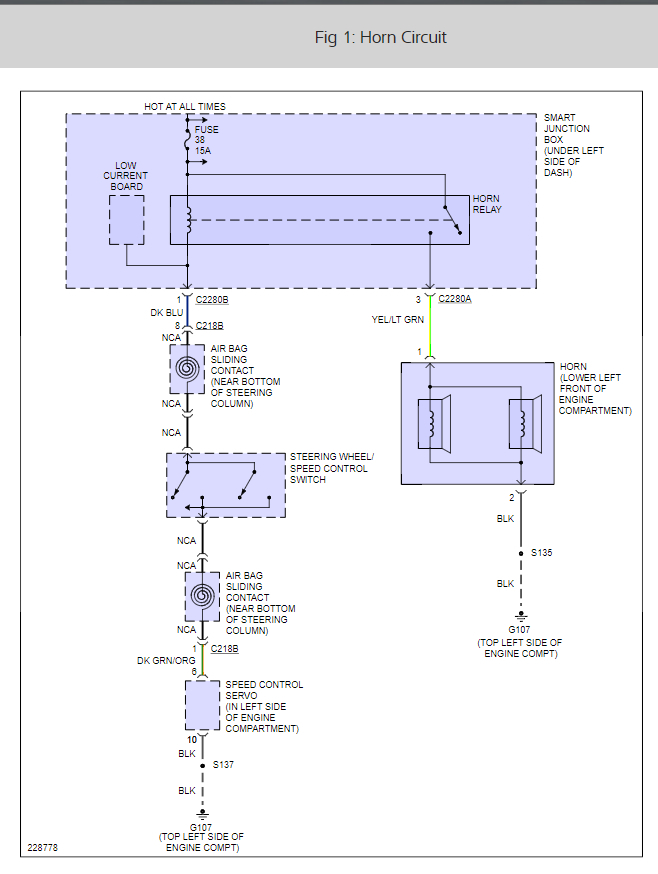 Multifunction switch, located on steering column, includes turn signal, hazard, headlight dimmer, flash-to-pass and front windshield wiper/washer switches. Ignition switch and lock cylinder are also mounted on steering column. Cruise control switch is integrated into clockspring harness with horn and air bag restraint system, all located on steering wheel. Driver's side air bag is located on center of steering wheel. Steering column switches circuits are protected by fuse No. 7 (40-amp) in Battery Junction Box (BJB), located in engine compartment. Steering column switch circuits are also protected by fuses No. 11, 15, 27, 36 and 38 in Central Junction Box (CJB), located behind left side of instrument panel.