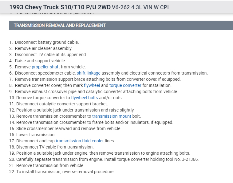 Since this is a 2wd, the transmission is easier and quicker to remove. I attached the directions from my manual for removal/replacement. However, here is a link that I feel will be more helpful: