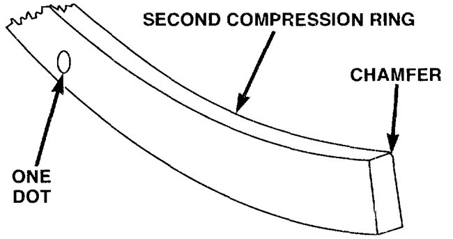 7. The second compression ring has a slight chamfer on the bottom of the inside edge and a dot on the top for correct installation.