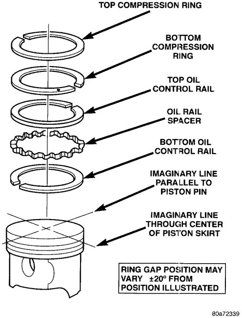- Oil rails - gap 180° apart on centerline of piston pin bore.