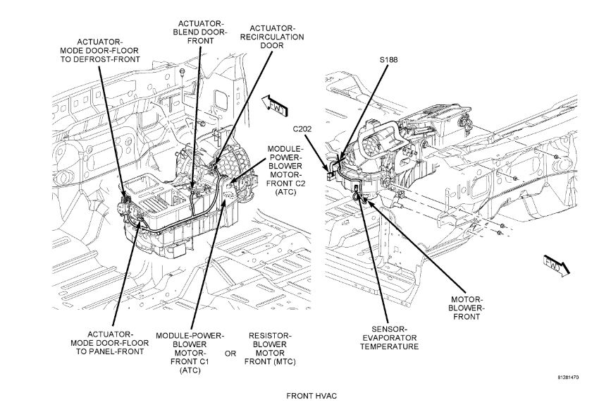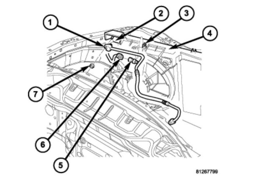The A/C discharge line (1) is the refrigerant line that carries refrigerant from the A/C compressor to the A/C condenser (2) and is secured to the condenser fan shroud (4) by a plastic retainer (3). The A/C discharge line has an integral fitting for the A/C pressure transducer (5) See: Refrigerant Pressure Sensor / Switch, HVAC > Components > Description.
