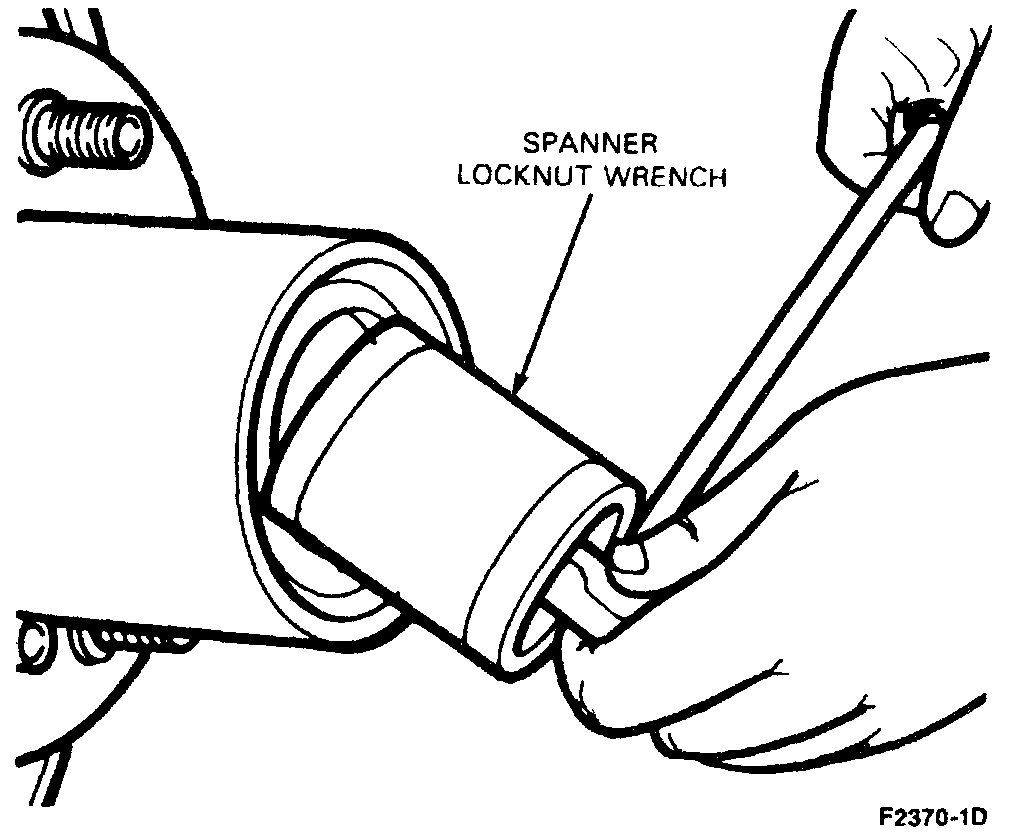 For vehicles equipped Dana model 44 with automatic hub locks, Dana model 50 and model 60 front drive axles, remove the outer locknut, lock washer and inner locknut with spanner locknut wrench.