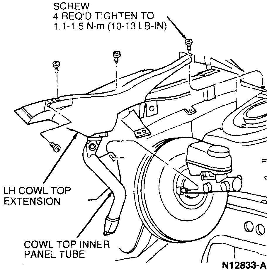 4. Remove nut retaining cowl top inner panel tube to brake master cylinder.