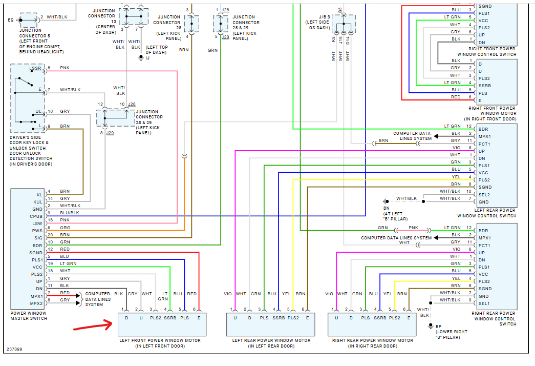 Please check out the wiring diagrams below, also this guide can help you test the wiring between the switch and driver's side window motor. Check out the images (below). Please upload pictures or videos in your response of any problems so we can see what to help you with.