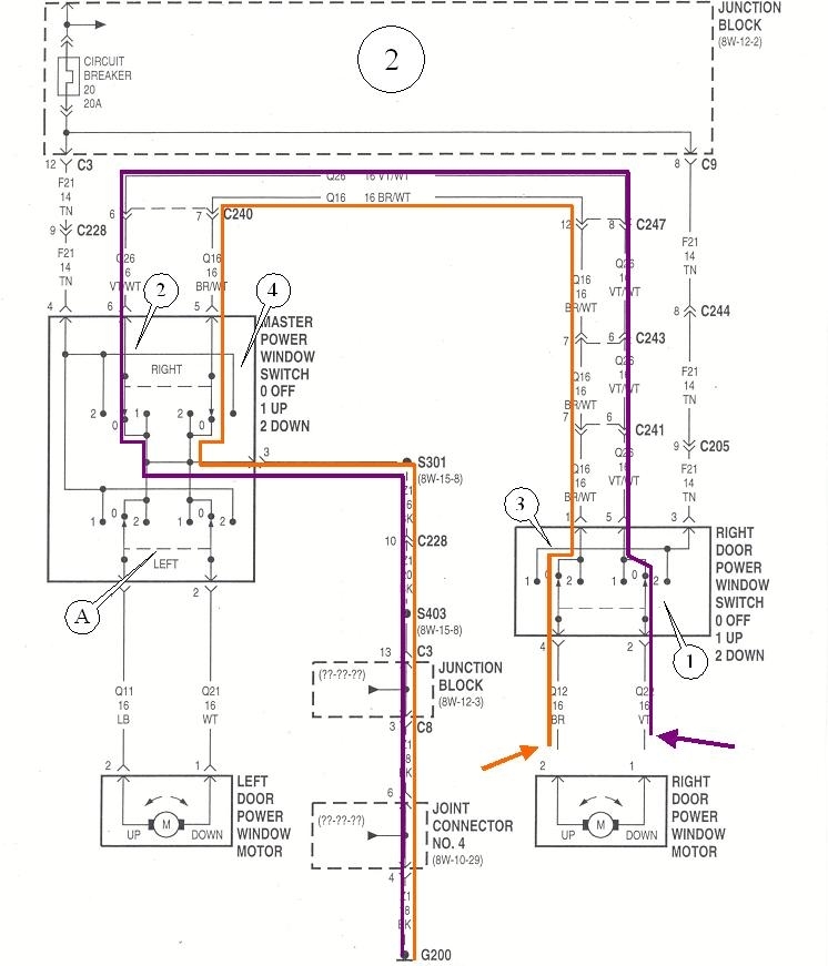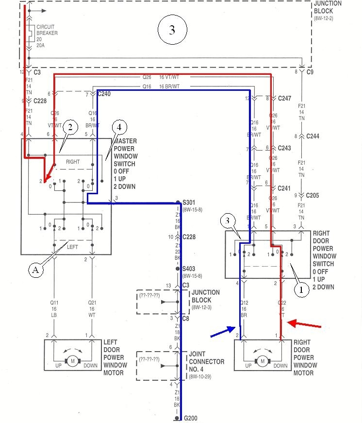 Chrysler's instructors are given vehicles to use in their classes, then after they have been poked and prodded for a couple of months, they do not want to release them to the public. Their solution is to donate them to technical college Automotive programs. We received a 1997 Dakota that I used for electrical training for many years. The diagram works well for explaining power windows because there are just two front windows to worry about. When you have four windows, the two rear circuits are the same as the right circuit in this diagram. The wiring diagram for your van is almost the same as this one, except, of course, the wire colors will be different. Also, if your van has a lock-out switch on the driver's switch assembly so kids cannot play with their windows, that would be in the top-most wire right under the circuit breaker. Diagram 1 shows the entire system.