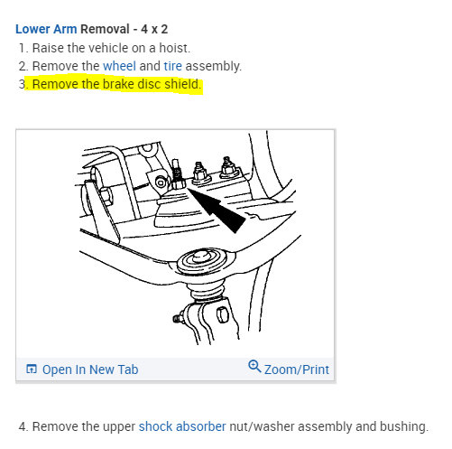 Also, I found something that may be of interest. The directions are for replacing the control arm, but there is a section explaining how to remove the shock. It indicated the shield behind the brake rotor needs to be removed. Take a look at pic 1 below.