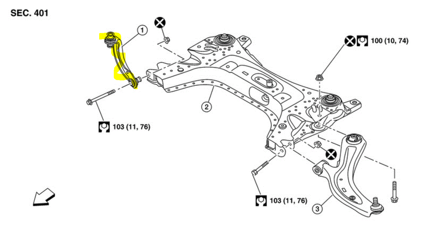 As far as the subframe, he was referring to the cross member under the engine. See the attached pic. I highlighted where there are bushings that could be bad or loose.