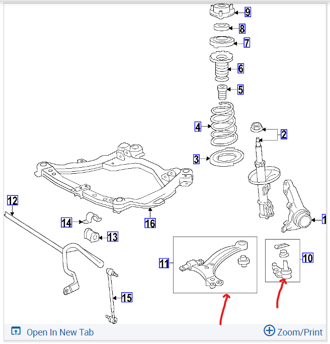 Once the front end is in the air, grasp the front left wheel and try to move it back and forth and up and down to check for play. Also, have a help move the wheel while you watch the tie rod end to check for play. Also, check the lower control arm bushings, they could have fallen apart and need to be replaced, I have marked in red in the images below to the parts I need you to check.