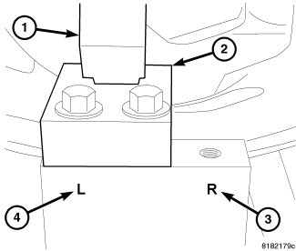 a. For left side knuckles, place the locator block (2) to the left side (4) on the Fixture. The side of the locator block with the angle cut goes downward, toward the Fixture. Install the mounting screws and tighten them to approximately 54 Nm (40 ft. lbs.).