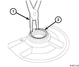 7. Remove the snap ring (2) from the knuckle using an appropriate pair of snap ring pliers (1).