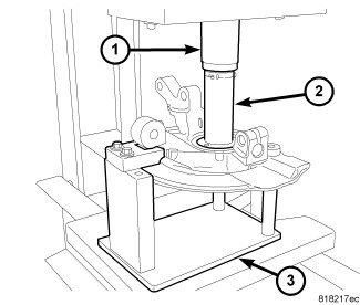 13. Place Remover/Installer (2) in the end of the hub (3). Lower the arbor press ram (1) and remove the hub from the bearing race.