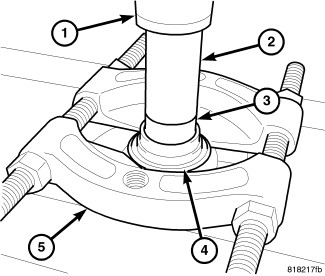 11. If the bearing race is still pressed onto the hub, install the Bearing Splitter (5), Special Tool , between the hub flange and the bearing inner race (4).