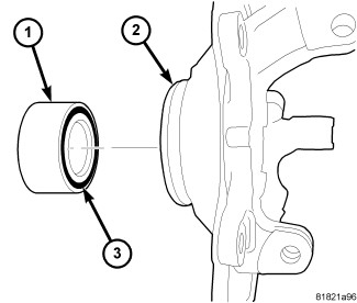 CAUTION: When installing the wheel bearing (1) in the knuckle (2) it is important to place the side of bearing with the wheel speed sensor magnetic encoder ring (dark band) (3) in the knuckle first. Otherwise, the wheel speed sensor will not operate correctly.