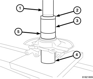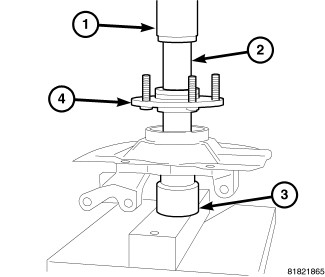 8. Place the knuckle in an arbor press. Support the knuckle from underneath using Remover/Installer (3), smaller end up against the wheel bearing inner race.