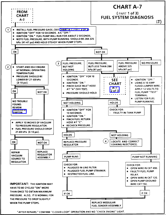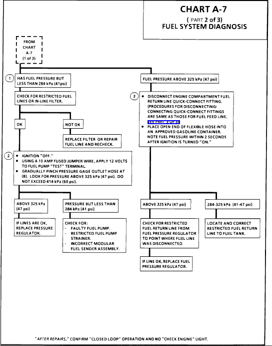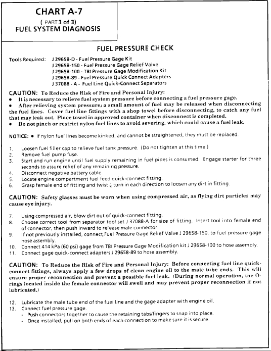 Pressure below 284 kPa (41 psi) may cause a lean condition and may set a Code 44 or Code 32. It could also cause hard starting cold and poor driveability. Low enough pressure will cause the engine not to run at all. Restricted flow may allow the engine to run at idle, or low speeds, but may cause a surge and stall when more fuel is required, as when accelerating or driving at high speeds.