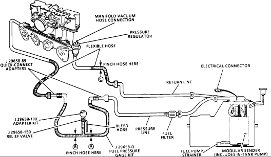 Restricting fuel flow at the fuel pressure gauge (at B) causes fuel pressure to build above regulated pressure. With battery voltage applied to the pump test terminal, pressure should rise above 325 kPa (47 psi) as the gauge outlet hose is restricted.