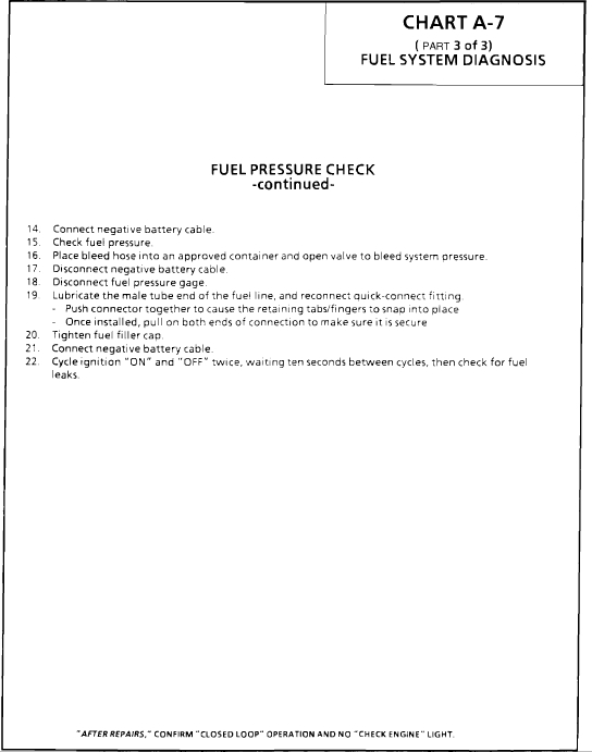 Turn ignition to "ON" position for two seconds, then turn ignition to "OFF" for ten seconds. Again turn to "ON" position, and check for fuel leak's.