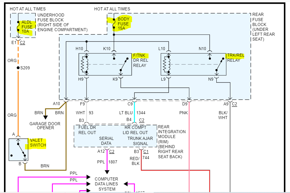 I attached the wiring schematic below for both circuits, so you have a reference. Also, pics 3 and 4 show the fuses to check. Pic 3 is the box under the seat in the rear. Start with pic 4, the ALDL fuse. I suspect that is the one that is at fault and is easier to access.