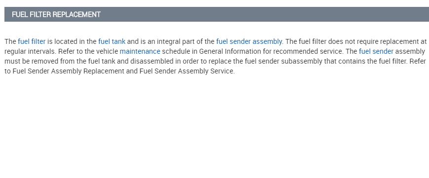 There is no external fuel filter for servicing. The filter is part of the fuel pump assembly in the fuel tank.