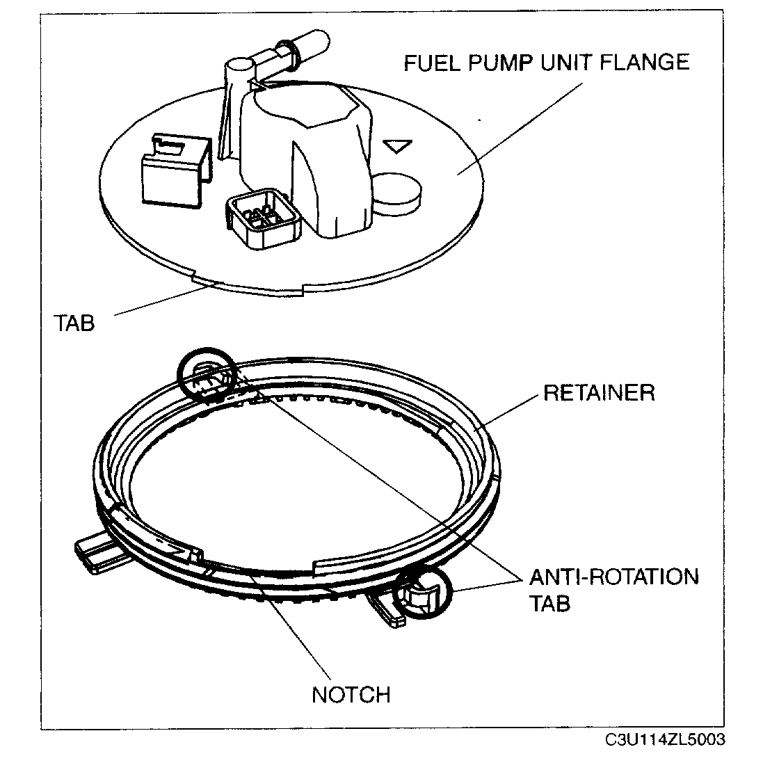 2. Verify the tab on the fuel pump unit flange with the notch on the retainer.