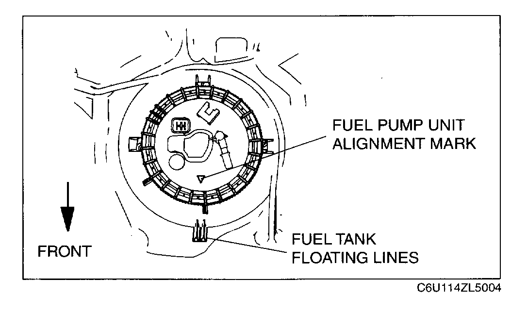 3. Verify that the fuel pump unit alignment mark and the floating lines on the fuel tank are aligned.
