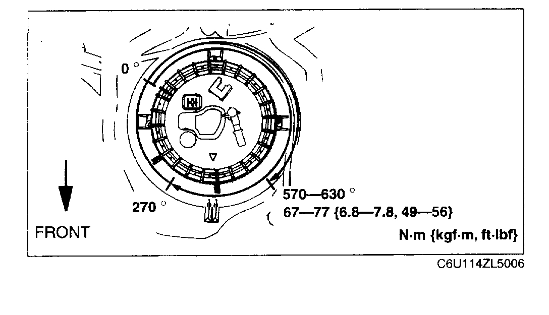 NOTE: The fuel pump unit will rotate and cannot be secured in the specified position if there is any gasoline on the gasket. Thoroughly wipe away all gasoline from the gasket.