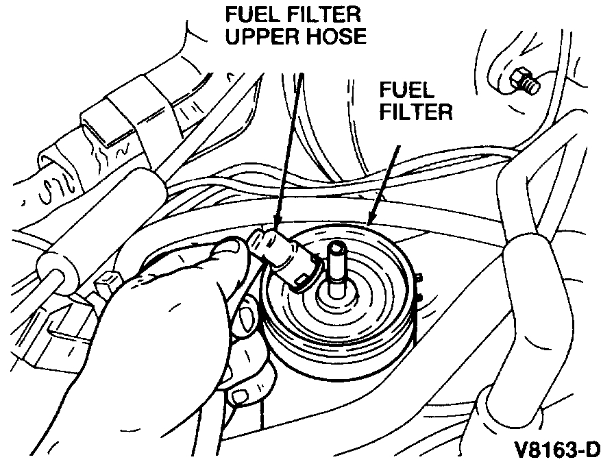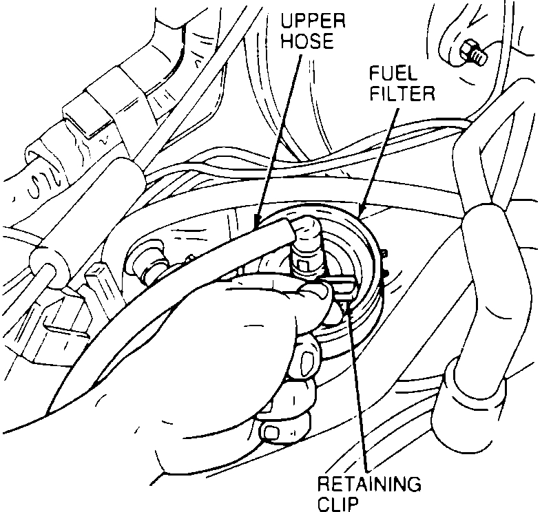 5. Disconnect the upper hose from the filter and drain any excess fuel into the container. Plug the hose.