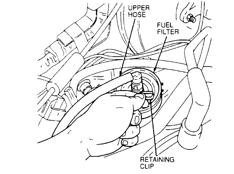 5. Disconnect the upper hose from the filter and drain any excess fuel into the container. Plug the hose.