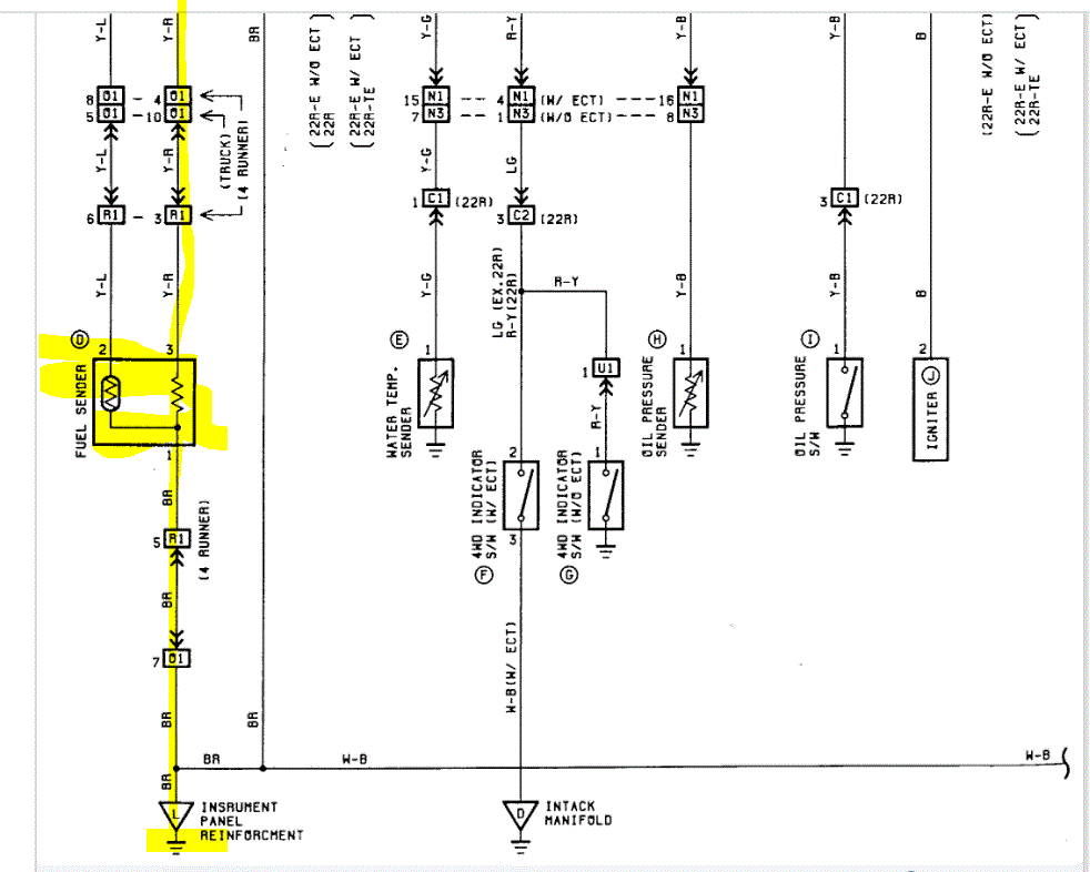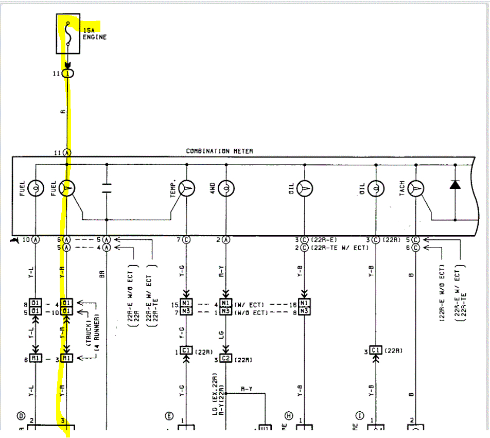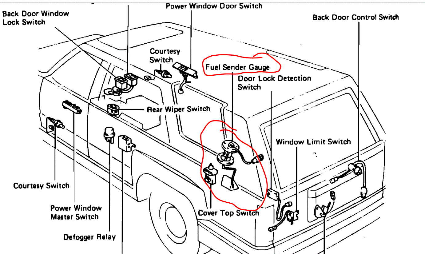 Because of the model year, I have very limited wiring schematics. However, there is a sending unit that mounts to the top of the fuel tank. First, check to see if it is still attached. See pic 1. Note: The pic shows a 4Runner, but the design is the same for both vehicles.