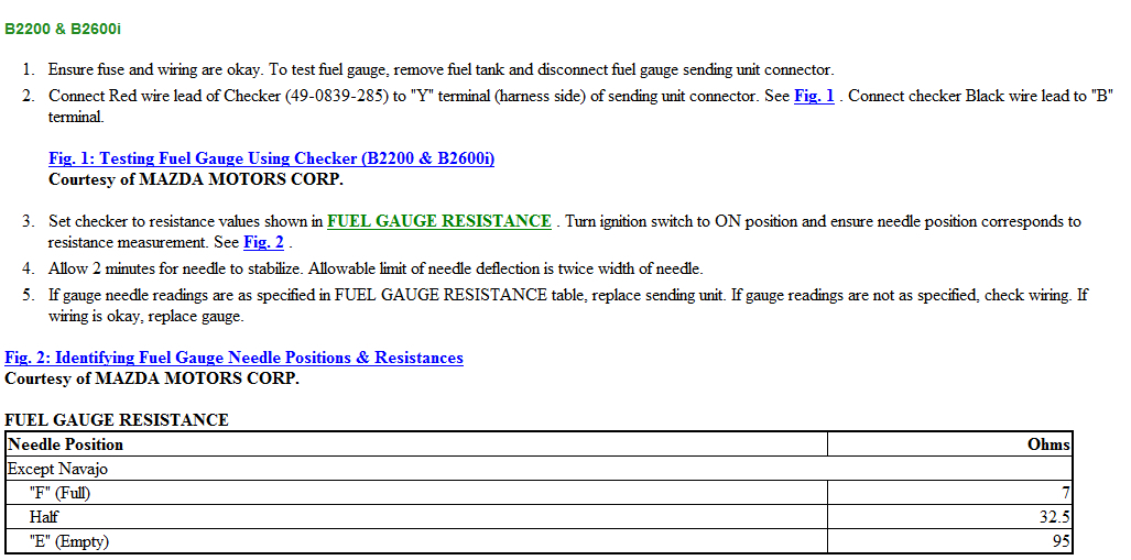 Fuse is probably good because gauge is working but with wrong indication, as a first step check fuel gauge connector visually for any damage or corrosion, fuel gauge sender unit is inside the fuel tank. It must be removed to perform the tests also check its connector and wires. Use ohmmeter fuel gauge sender unit connector removed, ignition on check picture 4 red lead of ohmmeter at connector pin y and the black one on pin b, check picture 1 and 2 for the tests and compare with the table specified values.