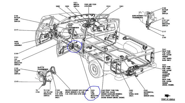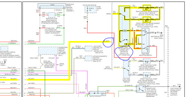 I attached a wiring diagram of the system for you. You need to go to the switching valve under the truck on the frame rail and test the yellow wire for voltage with a voltmeter. It should have about 7 volts on that line for the sender units.