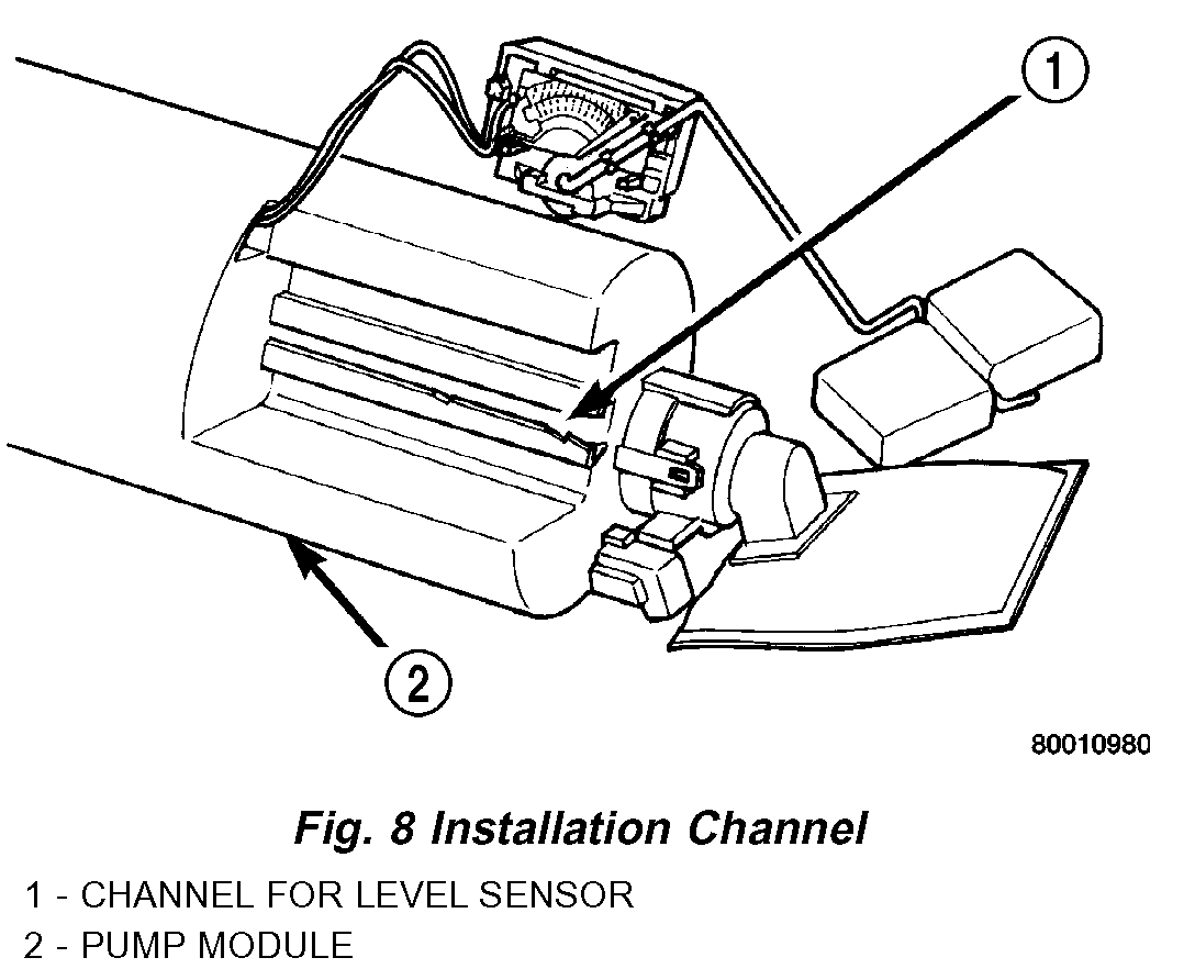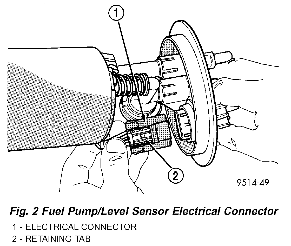 1. Depress retaining tab and remove the fuel pump/level sensor connector from the BOTTOM of the fuel pump module electrical connector (Fig. 2)